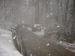 雪の舞う中、雲辺寺に到着した。写真中央には、徳島県と香川県の県境がある。