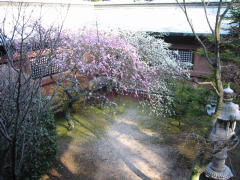 本堂近くの中庭の写真。紅と白の梅の色が庭にマッチしている。